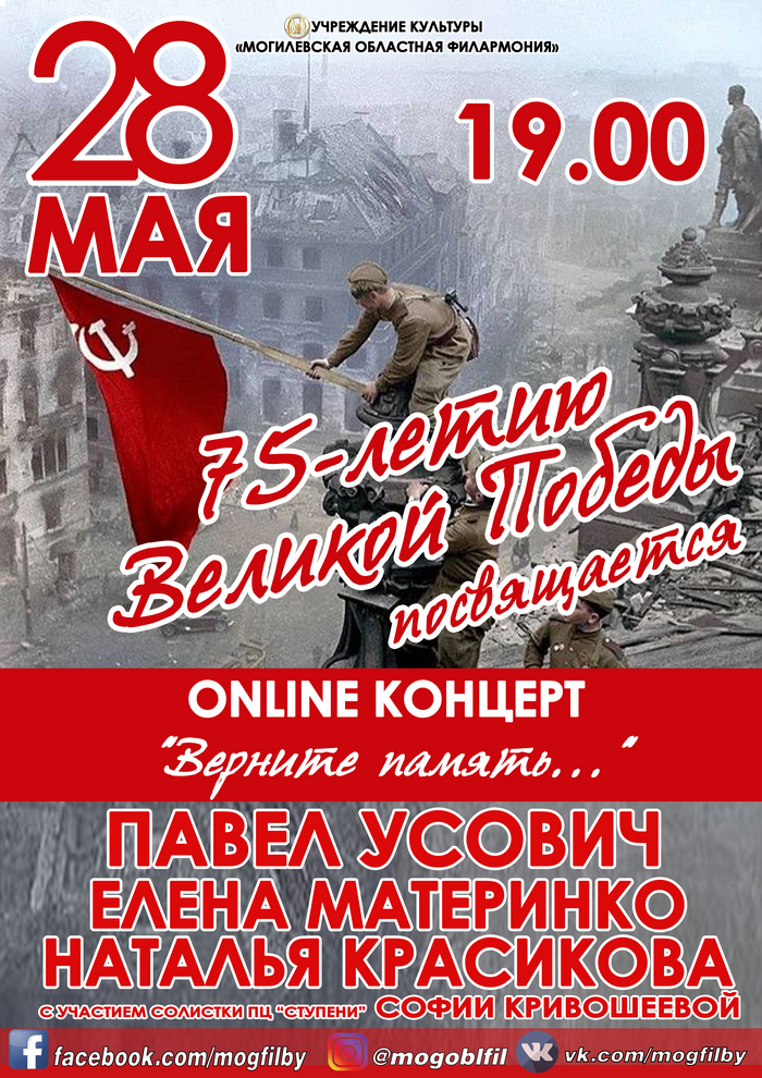 28 мая в 19.00 с online концертом, посвященным 75-летию Великой Победы "Верните память..." выступят: Павел Усович, Елена Материнко и Наталья Красикова (с участием солистки ПЦ "Ступени" Софии Кривошеевой).