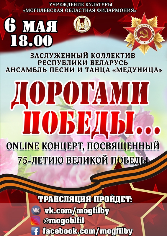 Великому событию посвящён онлайн концерт «Дорогами Победы». Песни военных лет прозвучат в исполнении заслуженного коллектива Республики Беларусь ансамбля песни и танца «Медуница».