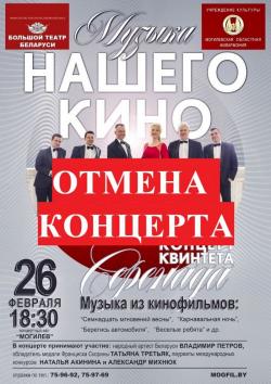 Концерт квинтета «Серенада» «Музыка нашего кино», запланированный на 26 февраля 2019 года в концертном зале «Могилев» (ул. Первомайская,10), отменяется по техническим причинам.