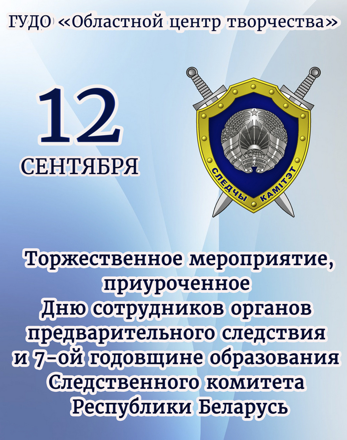 Торжественное мероприятие, приуроченное Дню сотрудника предварительного следствия и 7-ой годовщине образования Следственного комитета Республики Беларусь прошло в концертном зале ГУДО «Областной центр творчества» г. Могилева. Музыкальная программа была насыщена, в фойе гостей мероприятия встречал коллектив Могилевской областной филармонии струнный квартет «Gold String Quartet». Сотрудников следственного комитета с профессиональным праздником поздравили артисты Могилевской областной филармонии. Вели концерт Татьяна Малиновская и Александр Сиваев. Открывала торжественное мероприятие увертюра в исполнении заслуженного коллектива Республики Беларусь оркестра народных инструментов имени народного артиста Беларуси Л.Л.Иванова. Следом выступил Паша Любченко с гимном следственного комитета. Также порадовали зрителей музыкальными композициями Ольга Горничар, Елена Материнко, Павел Усович, Андрей Шафранский, ансамбль «Медуница», юные участники продюсерского центра «Ступени». Завершал концертную программу номер «Могилевская земля» в исполнении Павла Усовича и всех участников концерта. Режиссером концерта выступила Янина Даниленко.