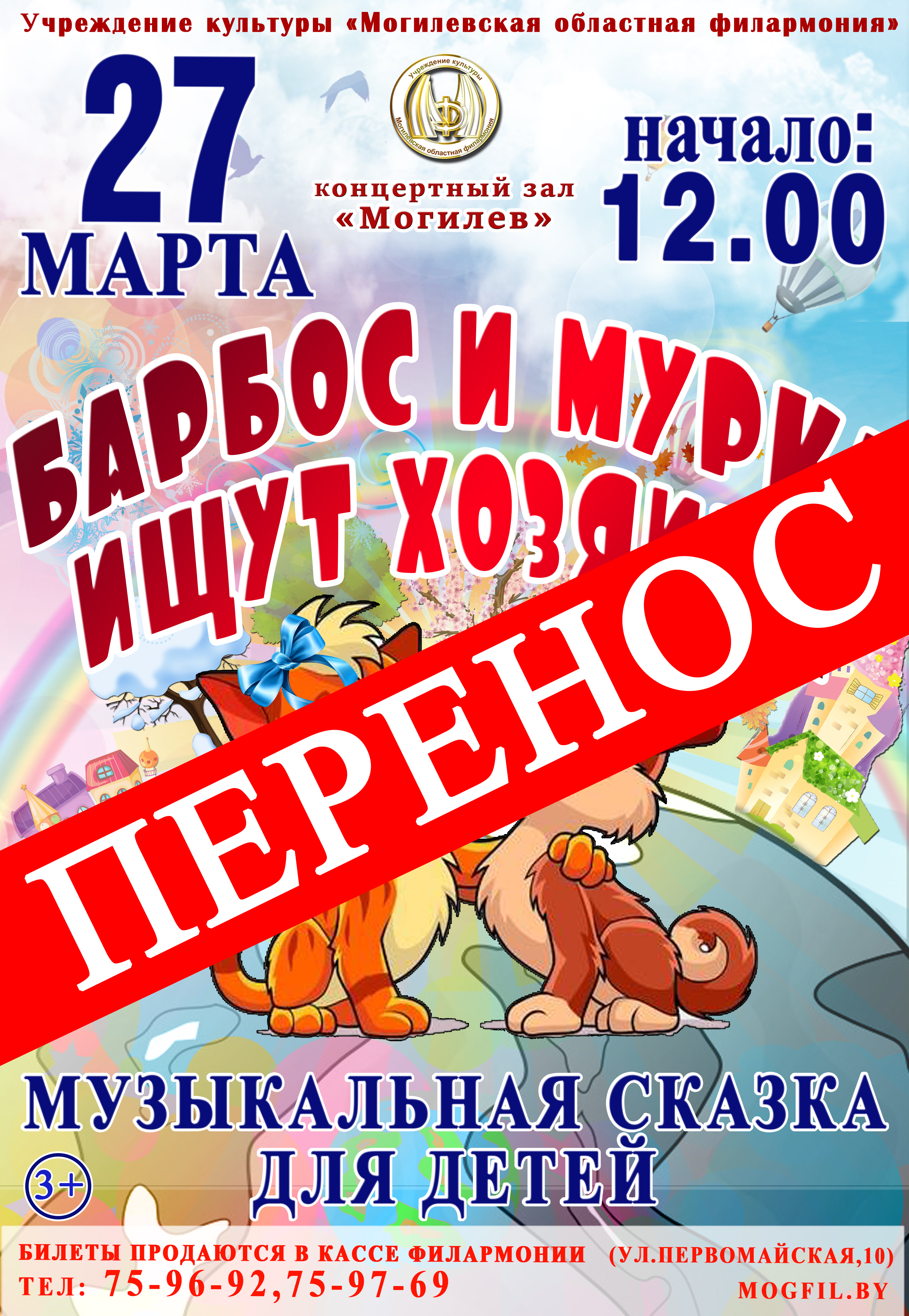 Уважаемые зрители! Обращаем Ваше внимание на то, что детская музыкальная сказка «Барбос и Мурка ищут хозяина», которая должна была состоятся 27 марта (пятница) переносится на 29 мая (пятница).
